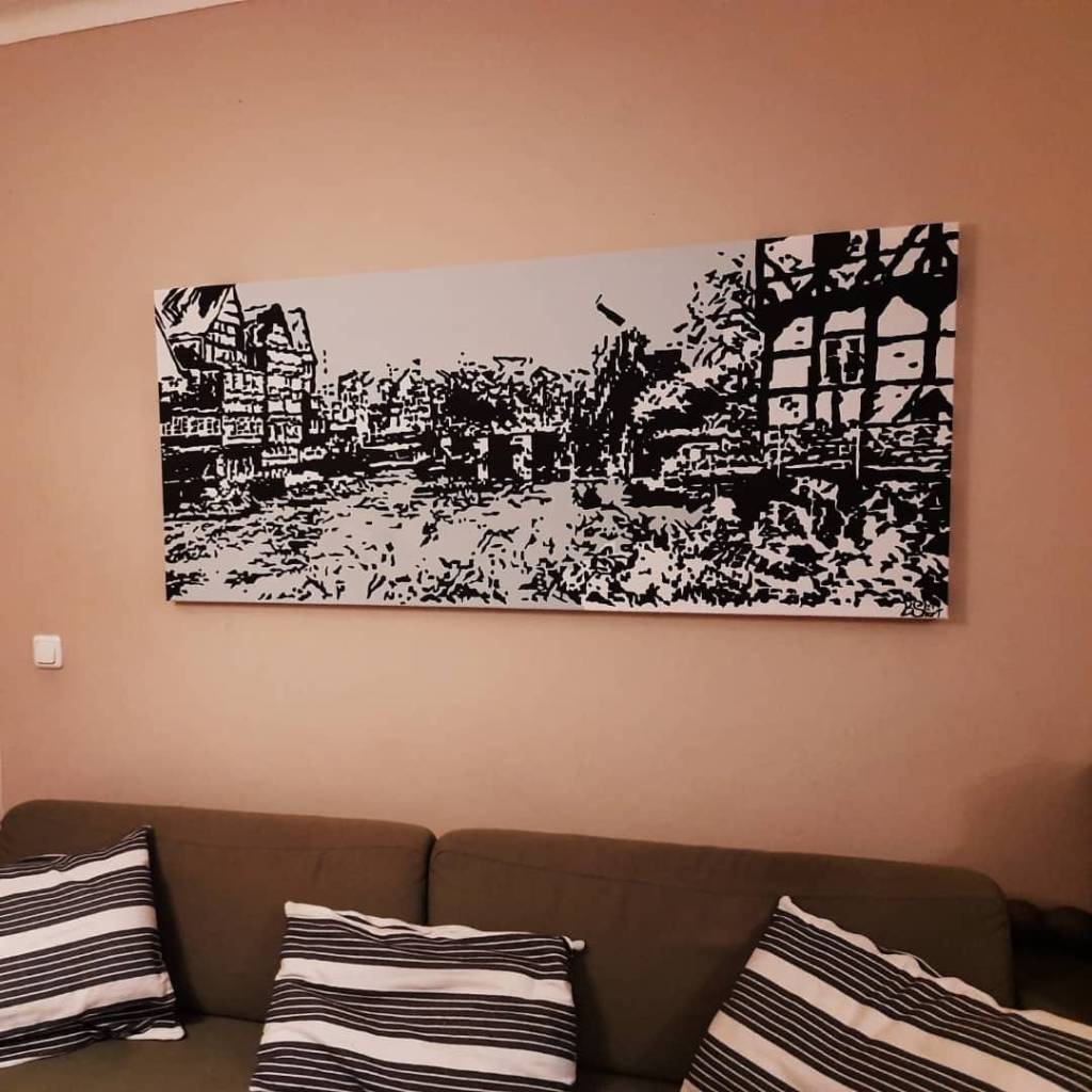 Alle meiner Bilder sind Unikaten und werden mit Acryl auf Leinwand gemalt. Gerne kann ich im Vorfeld ein paar Skizzen oder digitale Entwürfe erstellen, um einen Eindruck des fertigen Bildes zu zeigen. Je nach dem wie groß oder aufwändig das Bild ist, brauche ich ungefähr eine Vorlaufzeit von ca. 3 Wochen, um das Bild zu konzeptualisieren, malen und imprägnieren.